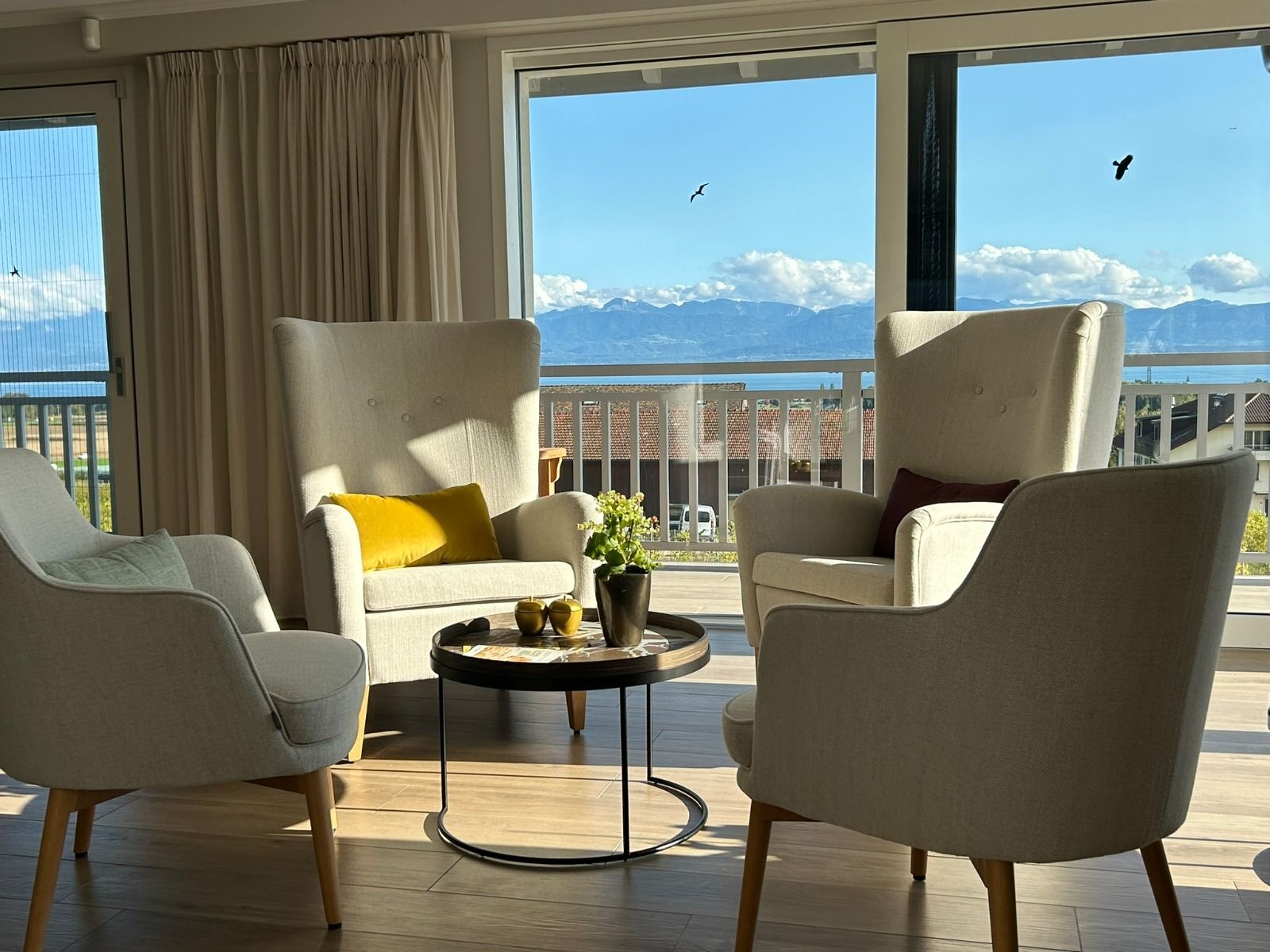 Die geräumigen, lichtdurchfluteten Gästezimmer verfügen über ein eigenes Badezimmer mit Dusche.