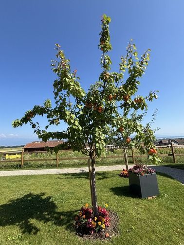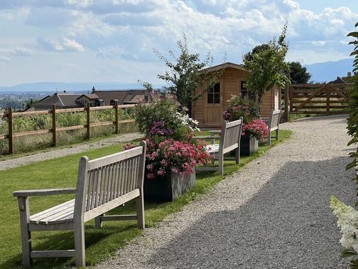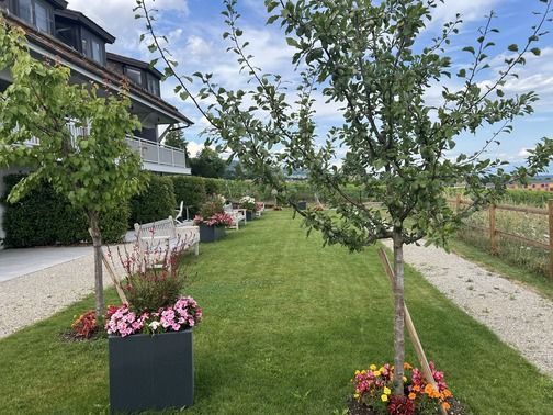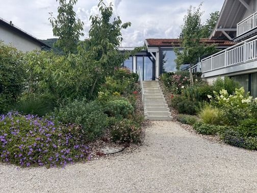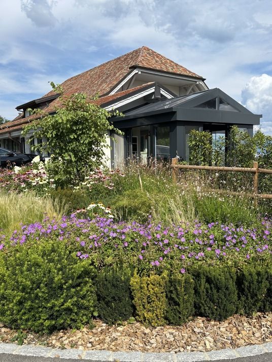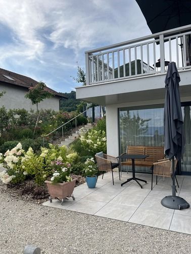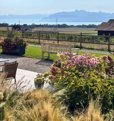 Les jardins et espaces extérieurs de la Maison Le Verger invitent à la sérénité. Entre pommiers et poiriers chargés de fruits, massifs fleuris et vues imprenables sur le lac Léman et les Alpes, chaque recoin offre un instant de paix. Des bancs et des allées bordées de fleurs permettent de contempler le paysage, de partager des conversations tranquilles ou simplement d’écouter la nature. Un cadre idéal pour se ressourcer et nourrir l’inspiration.